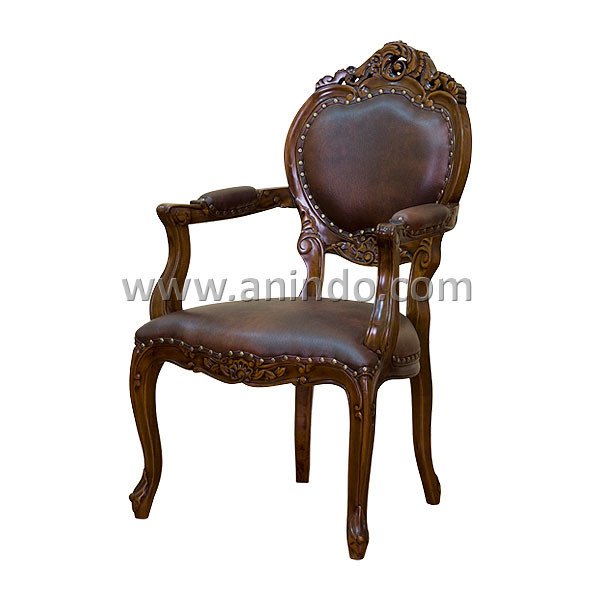 Our rococo chair arm is made of?mahogany wood in pecan finish. Upholstered in brown faux leather.