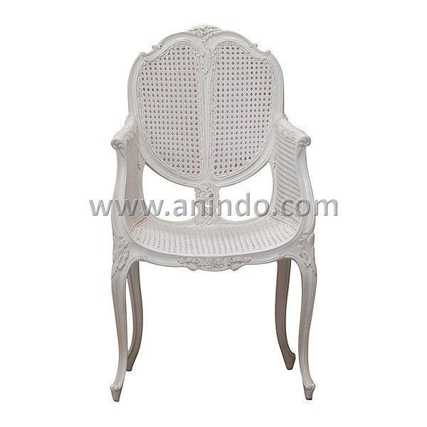 Romeo arm chair is made of mahogany wood with rattan in white painted finish.