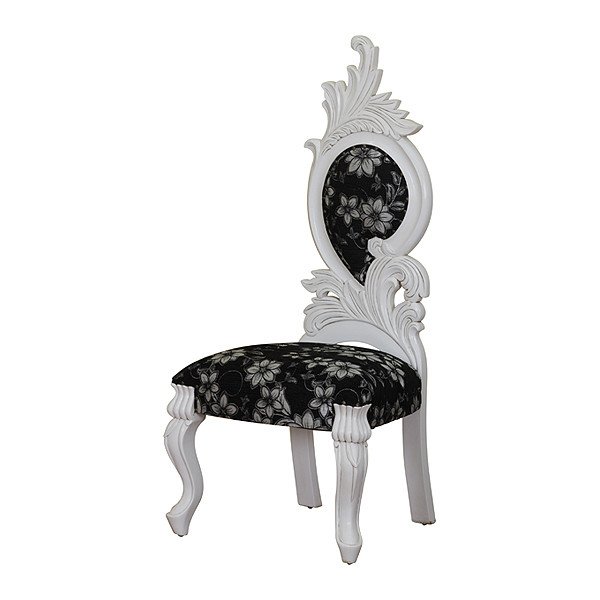 Our tall back chair lower is made of?mahogany wood in white painted finish. Upholstered in black floral fabric.