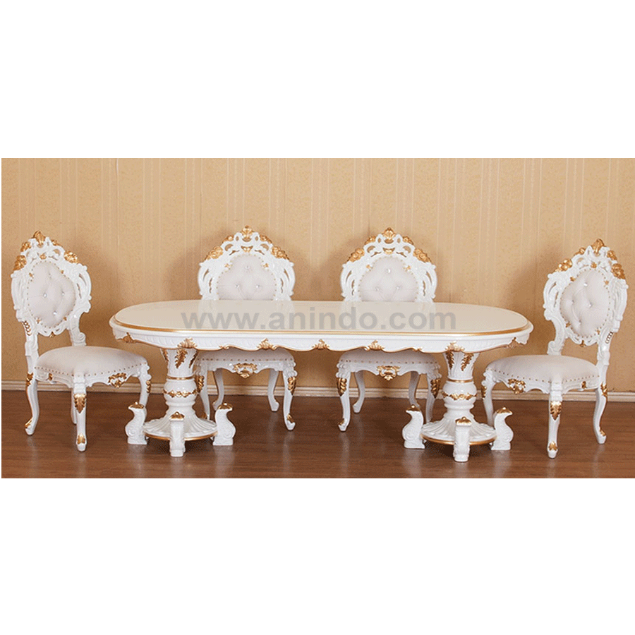 Our?carved set?dining table is made of mahogany?wood in white combine with gold painted finish. With 6 dining chairs.