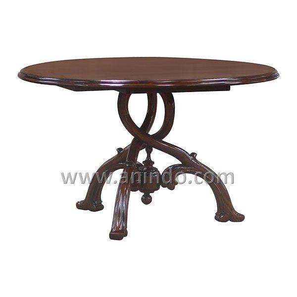 Jepara round dining table is made of mahogany wood in walnut finish.