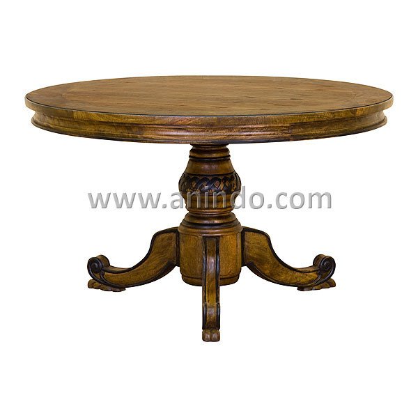 Jepara round dining table is made of mahogany wood in walnut finish.