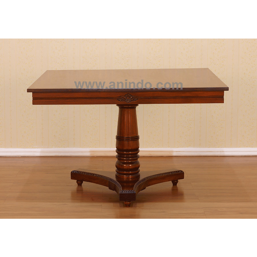 Square dining table carved is made of mahogany wood in walnut finish.