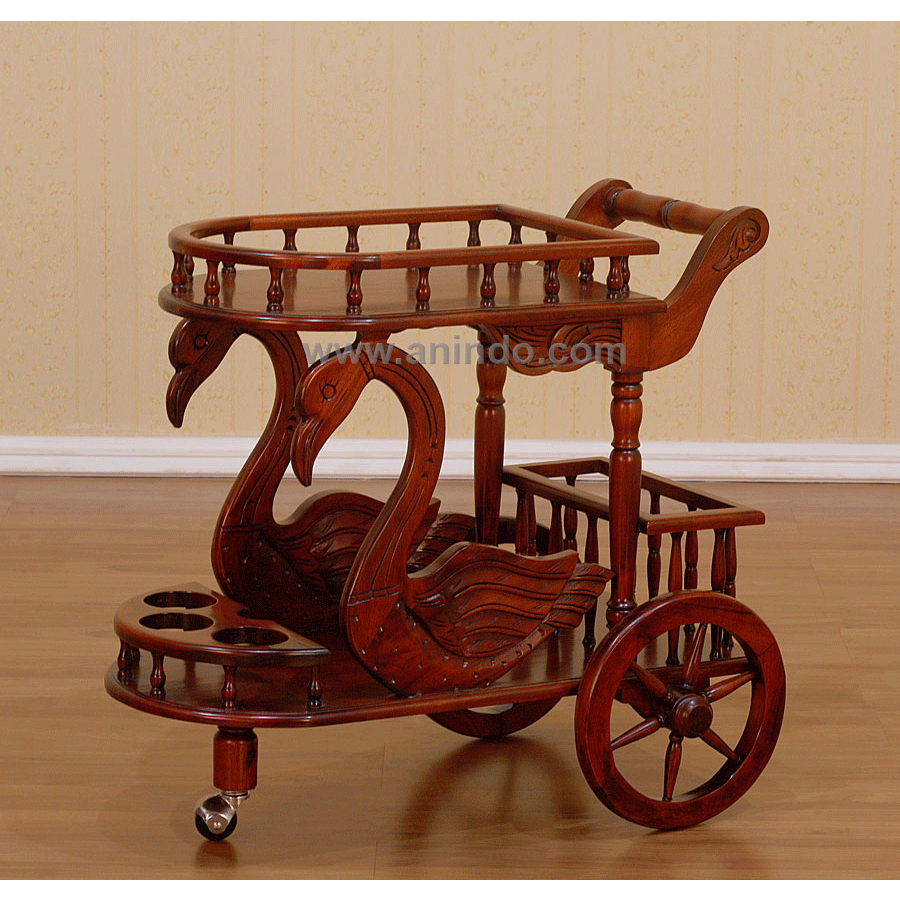 Swan tea cart is made of solid mahogany wood in pecan finish. With wheels attached.