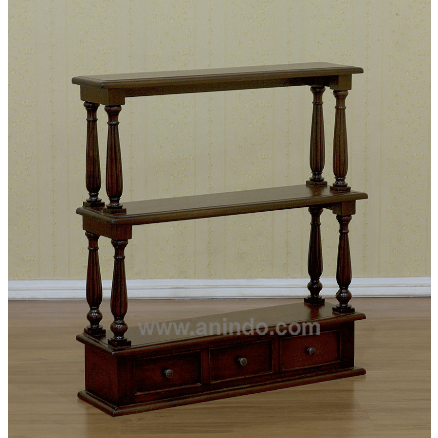 3 drawers rack with shelves is made of solid mahogany wood in walnut finish. Antique solid brass handles.