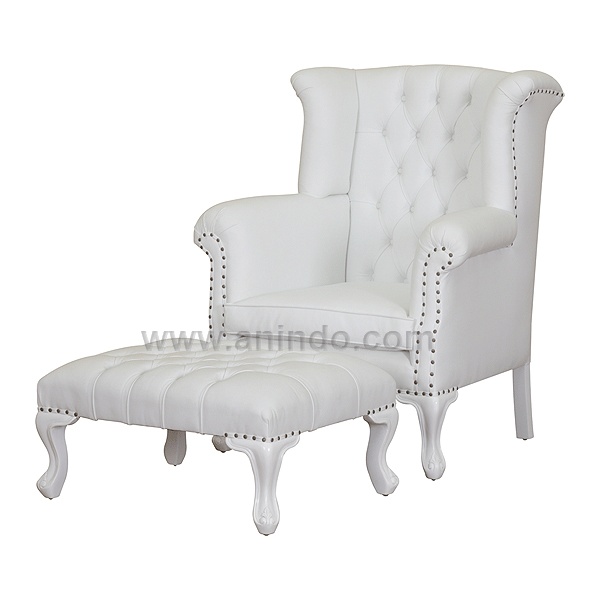 Our wing back chair with stool?is made of solid mahogany wood in?white painted finish. The fabric is 100% cotton.