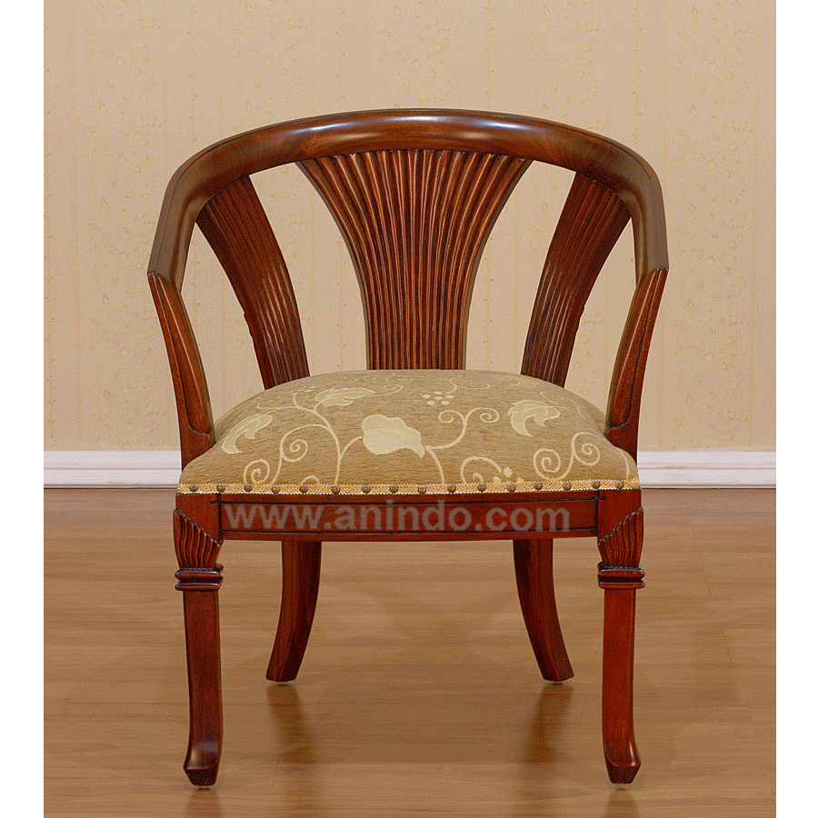 Our kipas carved?chair is made of solid mahogany wood in walnut finish. Upholstered in cream floral fabric.