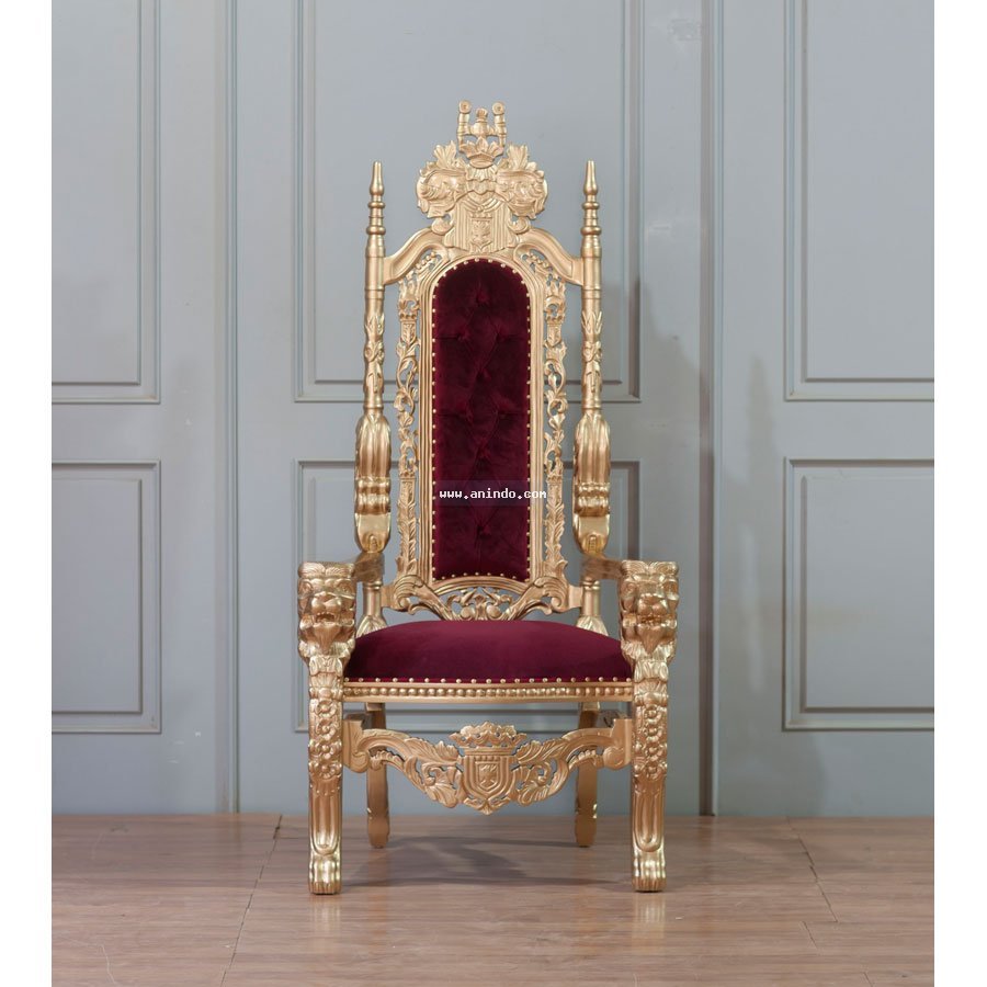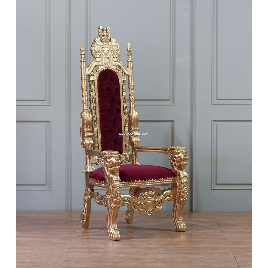 King throne chair 180 cm tall is made of mahogany wood in gold painted finish. Upholstered in red velvet fabric.