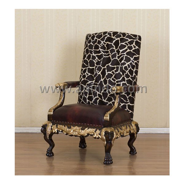 Lionel arm chair is made of mahogany wood in standard combined with gold painted finish. Upholstered in antique brown cow leather mixed zebra fabric.