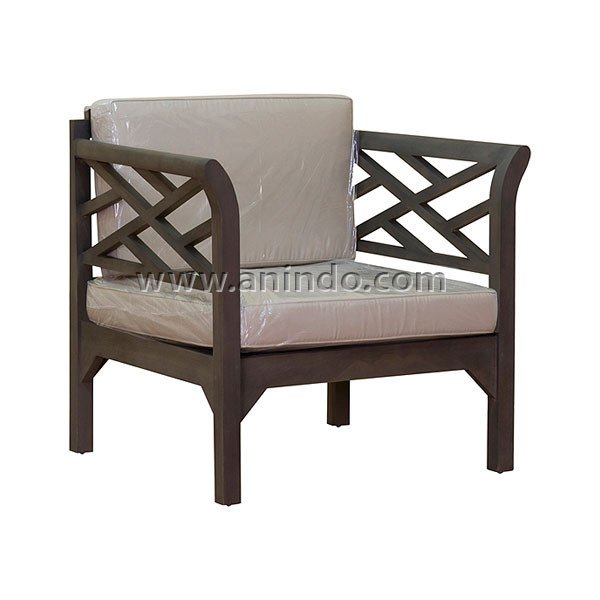 Our paula chair is made of solid mahogany wood in grey finish. With cream fabric cushions.