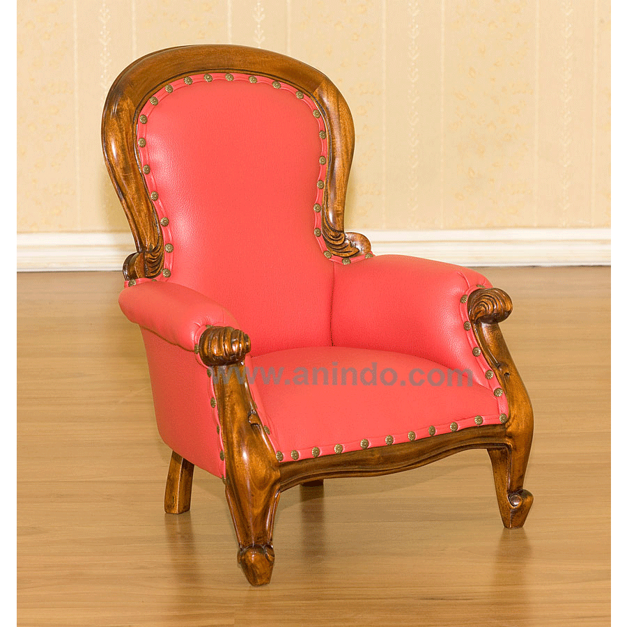 Mini grandfather chair is made of solid mahogany wood in pecan finish. Upholstered in red faux leather.