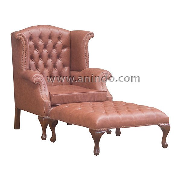 Our wing chair with stool is made of solid mahogany wood in pecan finish. Upholstered in brown faux leather.