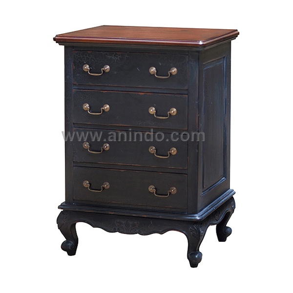 Alpha chest 4 drawers made of mahogany wood in distressed black painted with solid color wooden top finish. Antique solid brass handles.
