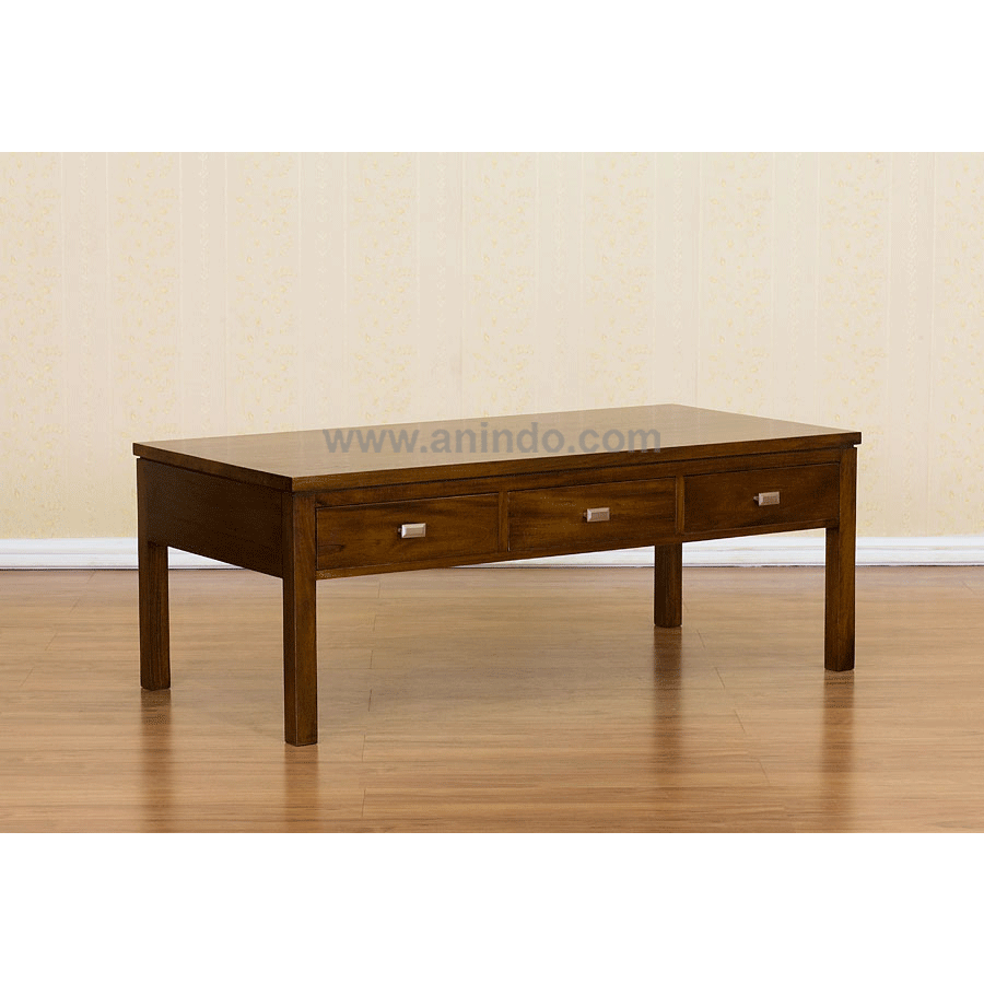 3 drawers coffee table is made of solid mahogany wood in walnut finish.