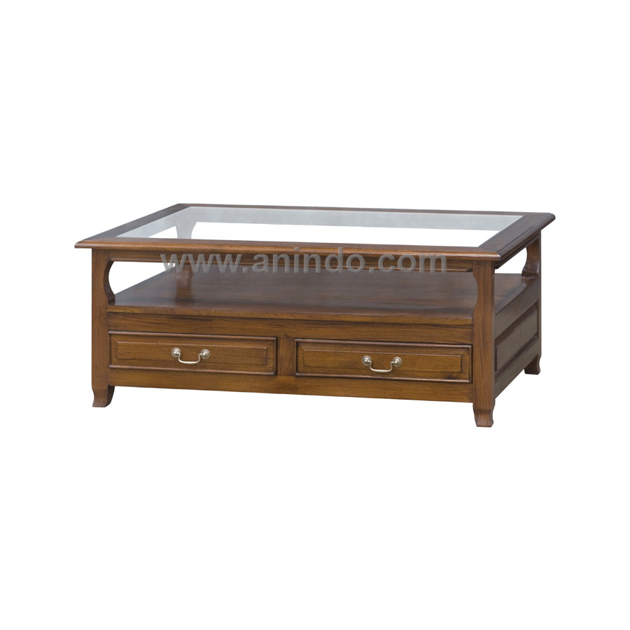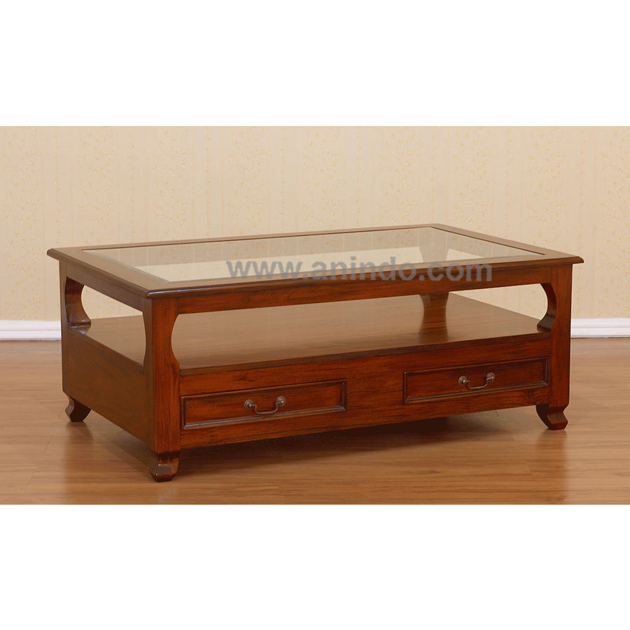 Mena coffee table with glass and drawers is made of solid mahogany wood in pecan finish.