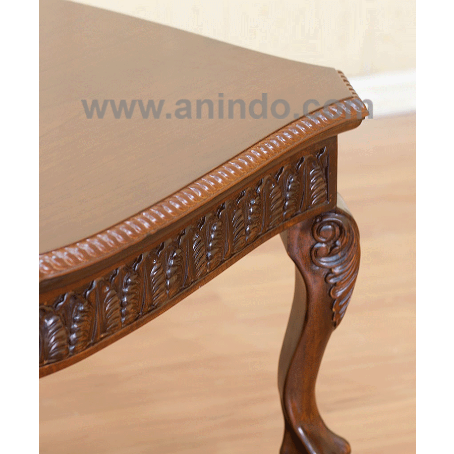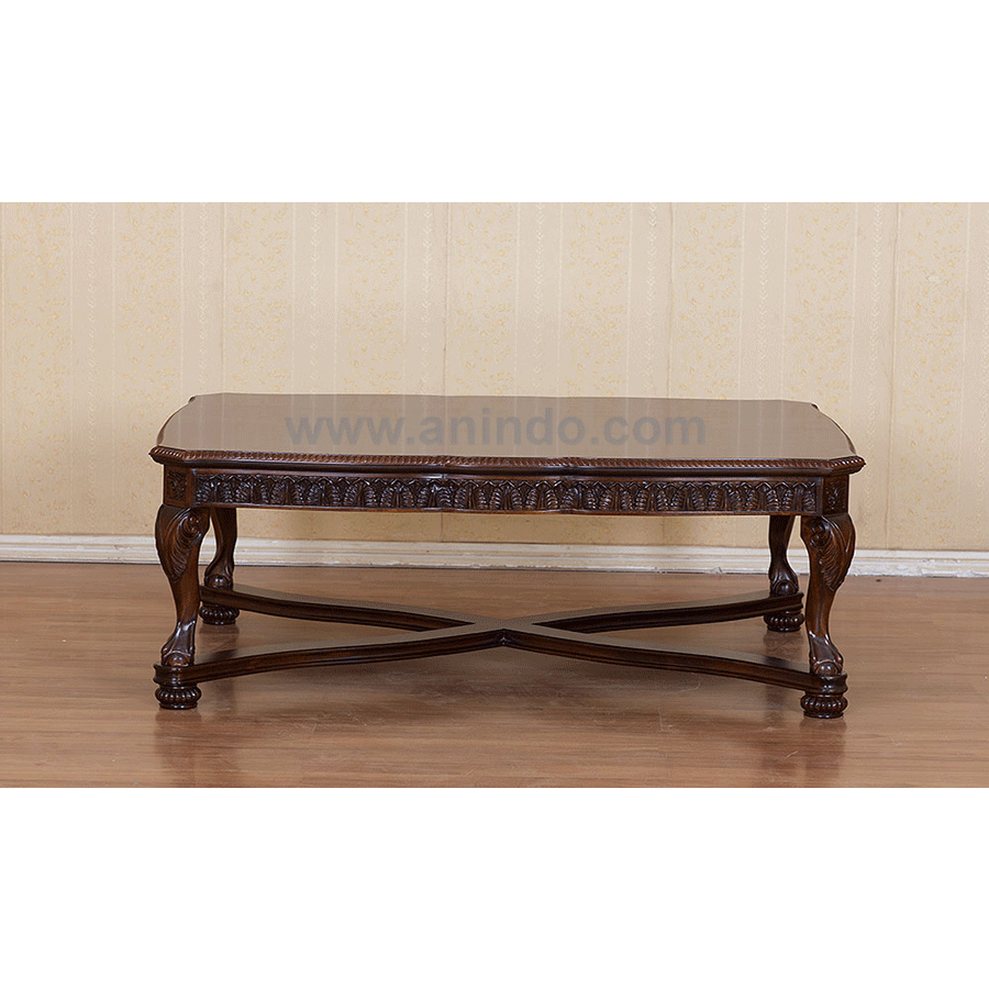 Coffee table carved is made of solid mahogany wood in walnut finish.