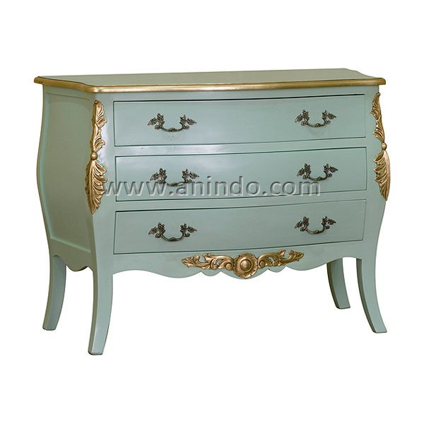 Our 3 drawers commode is made of mahogany wood in grey combined with gold painted finish.