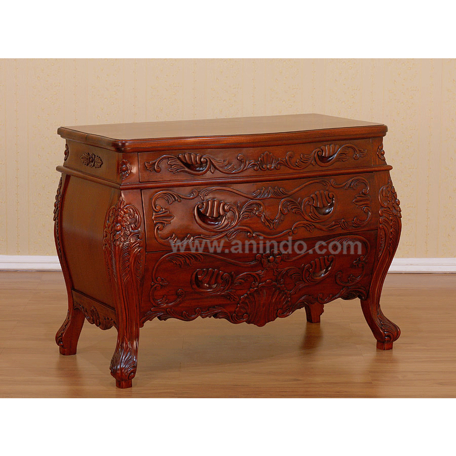 3 drawers commode with carving is made of mahogany wood in pecan finish.