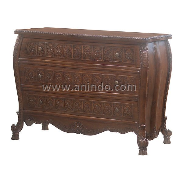 3 drawers commode with carving is made of mahogany wood in pecan finish.