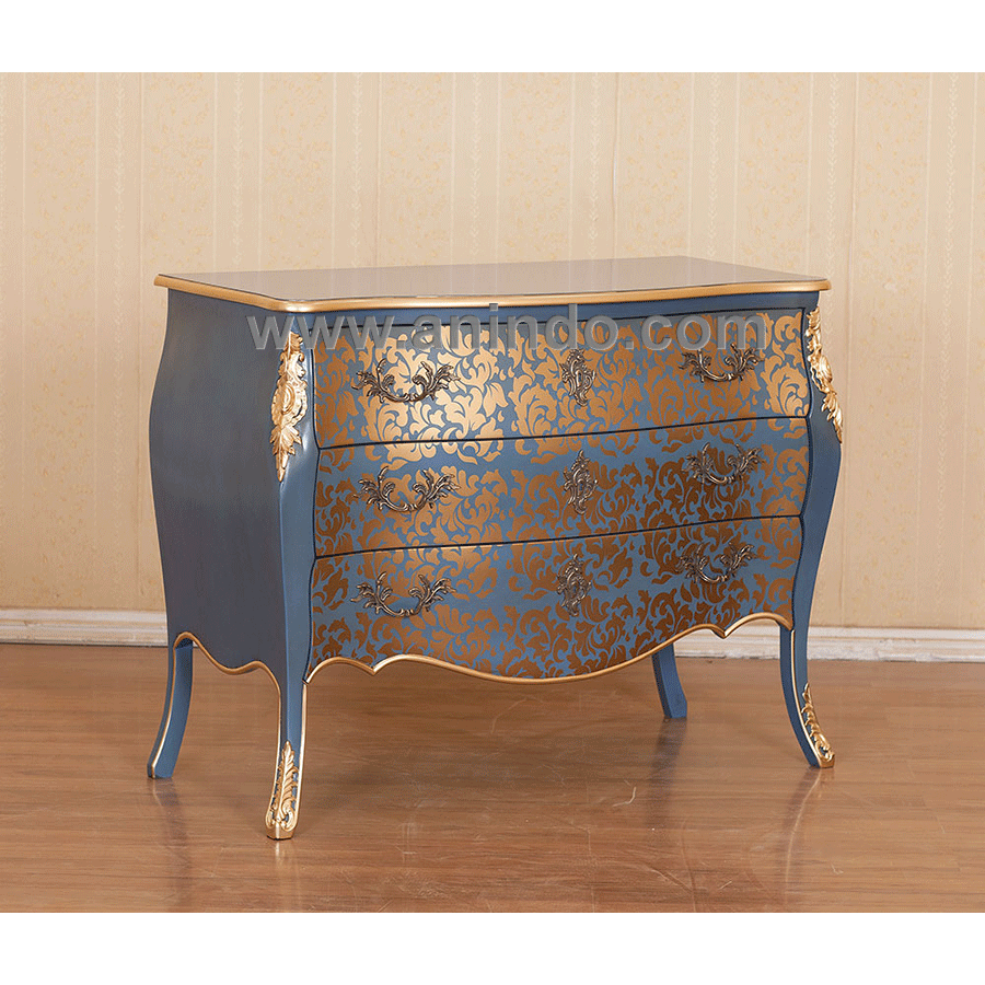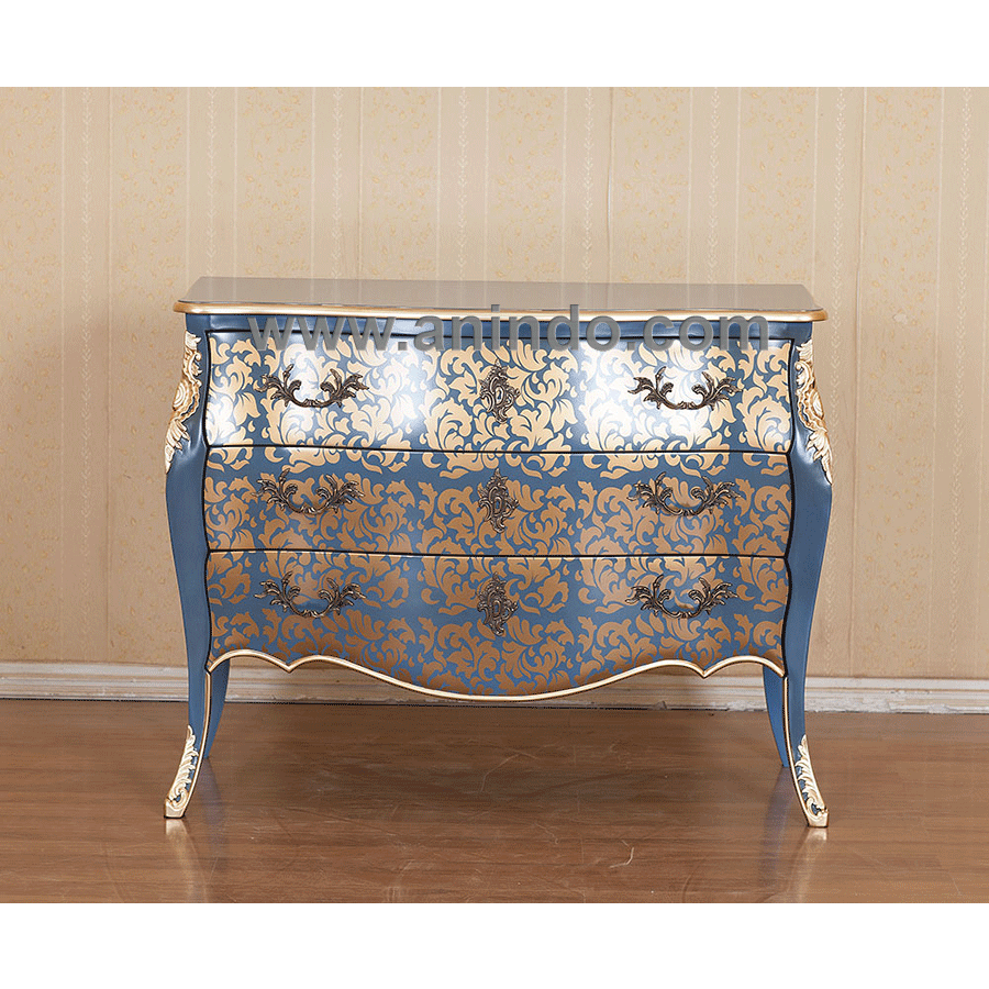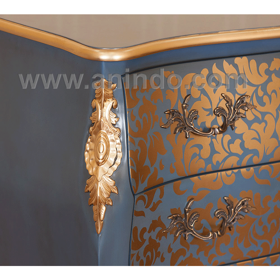 Our commode 3 drawers is made of mahogany wood in blue combined with floral gold painted finish.