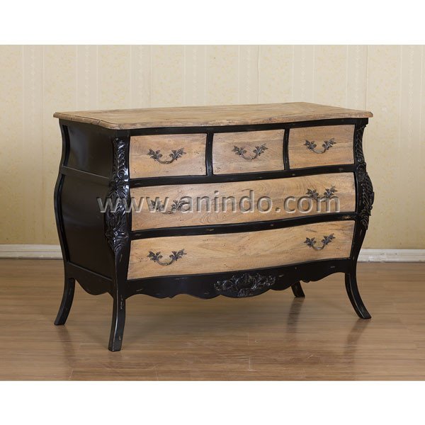 San fernando commode 5 drawers black is made of sustainable solid mango wood in antique distressed black painted with rustic solid mango wood on top and each drawers. Antique solid brass handles.