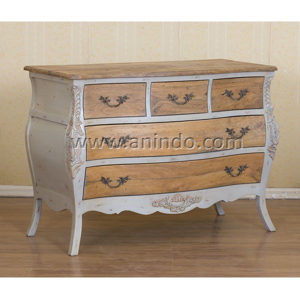 San fernando commode 5 drawers grey is made of sustainable solid mango wood in antique distressed light grey painted with rustic solid mango wood on top and each drawers of it. Antique solid brass handles.