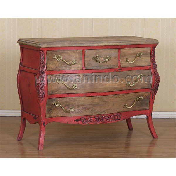 San fernando commode 5 drawers red is made of sustainable solid mango wood in antique distressed red painted finish with rustic solid mango wood on top and each drawers.