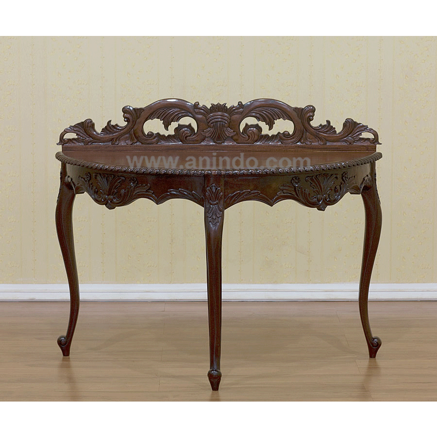 Halfmoon console table is made of solid mahogany wood in walnut finish.