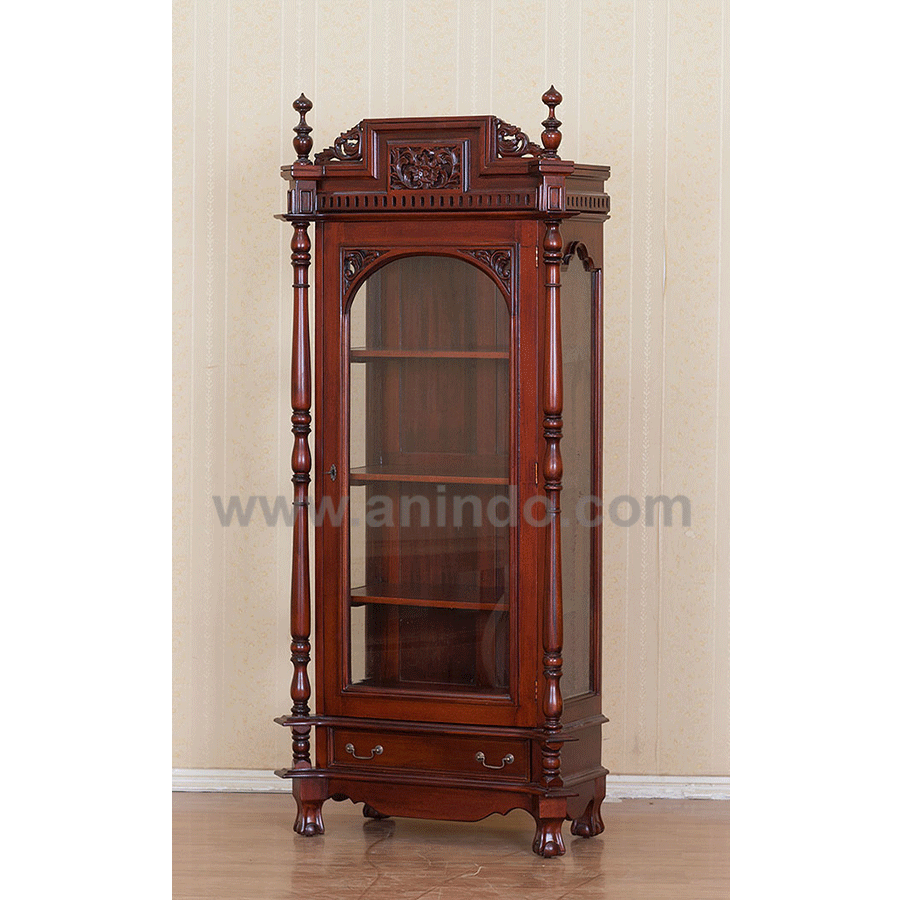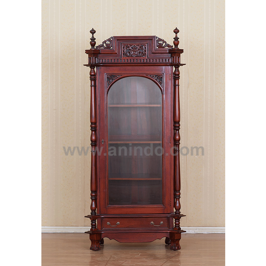 Our 1 door carved display cabinet 1 drawer is made of mahogany wood in walnut finish.