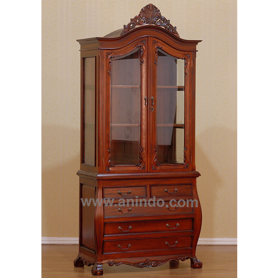 Display cabinet carved 2 doors and 6 drawers is made of mahogany wood in red mahogany finish.