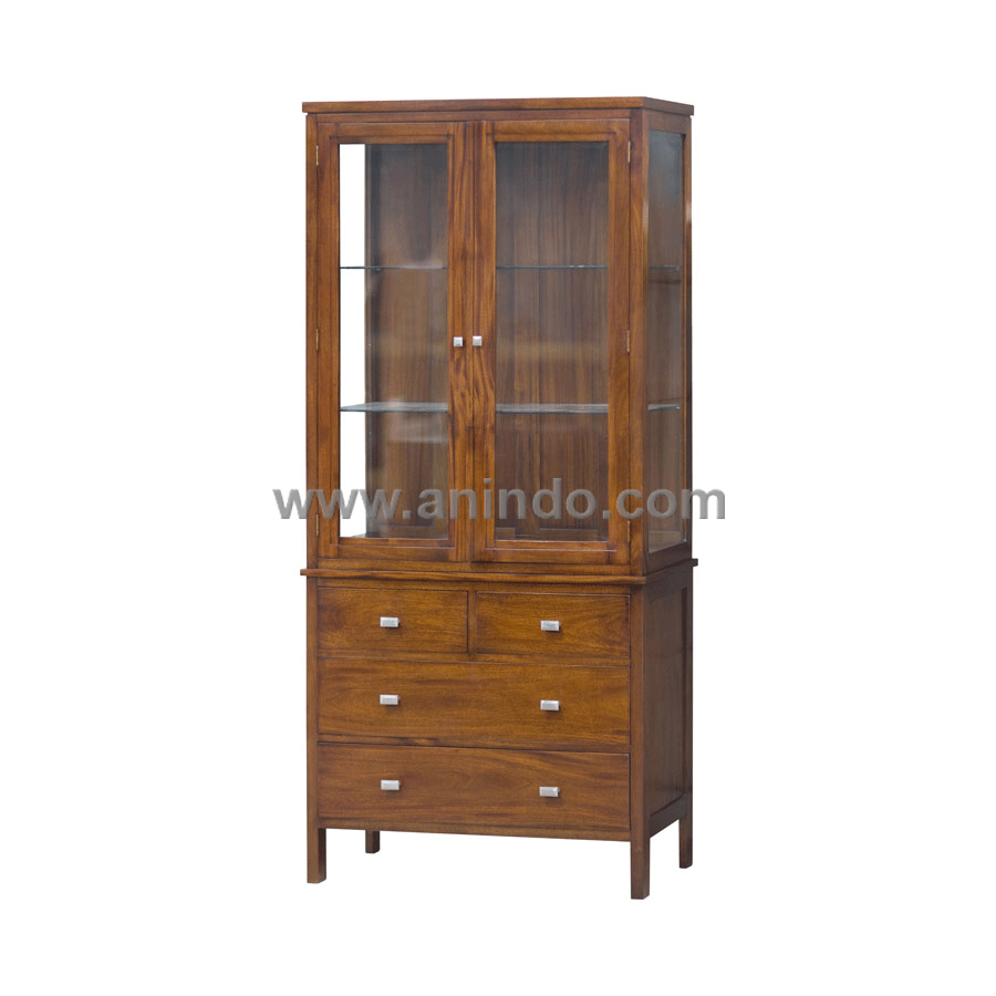 Display cabinet 4 drawers is made of solid mahogany wood in pecan finish.