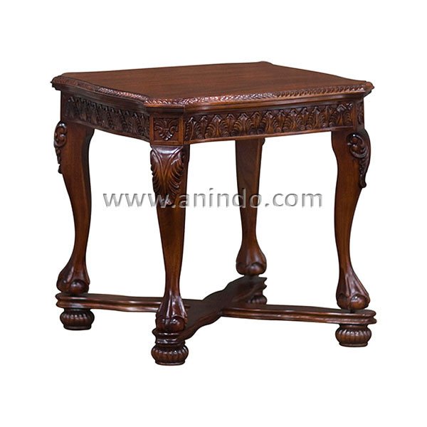 Table carved square is made of solid mahogany wood in walnut finish.