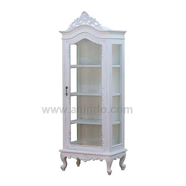 Kenny display cabinet 1 door with glass is made of solid mahogany wood in white painted finish. Antique solid brass handle & key.