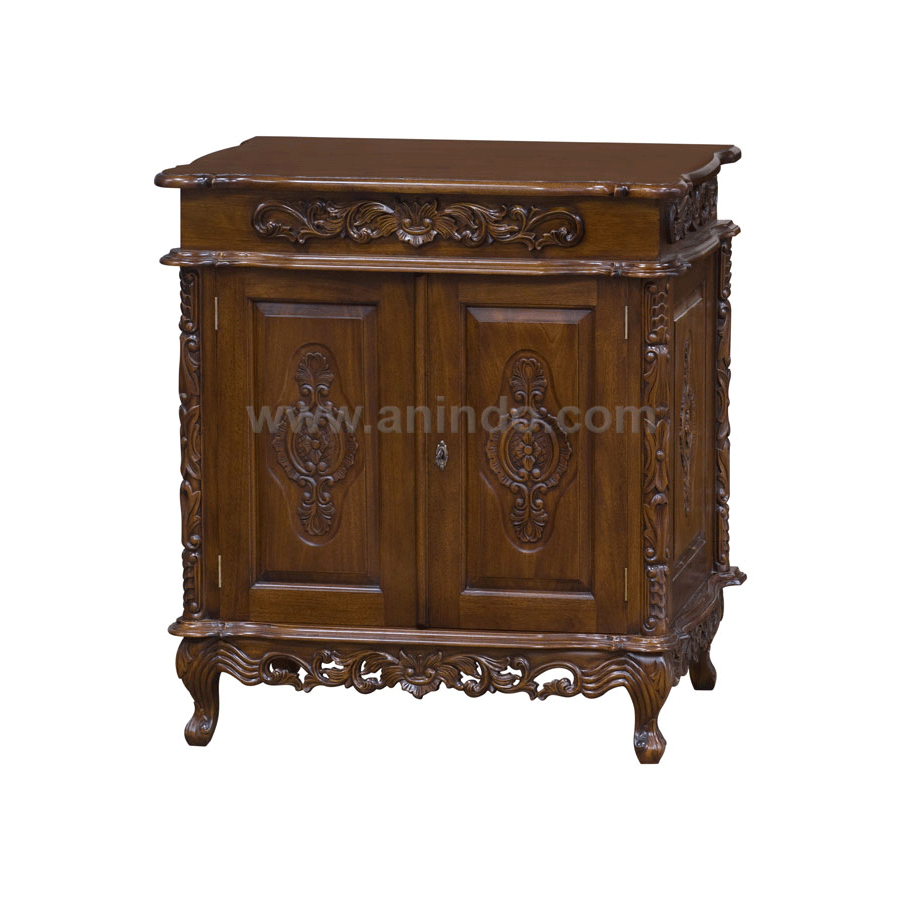 Pedro 2 doors small cabinet is made of solid mahogany wood in walnut finish. Antique solid brass handle & key.