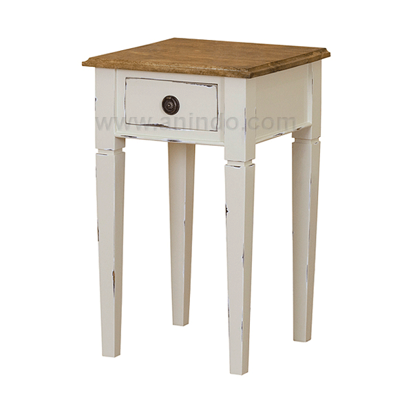 Square small table is made of mahogany wood in antique white painted finish with natural finish top. Antique solid brass handle.