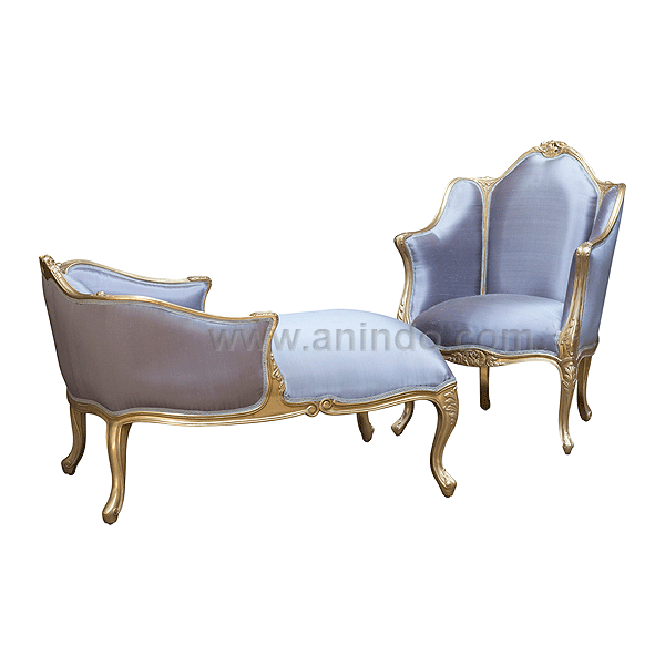 Antoine lazy chair is made of solid mahogany wood in gold leaf finish. Upholstered in light blue silk fabric.