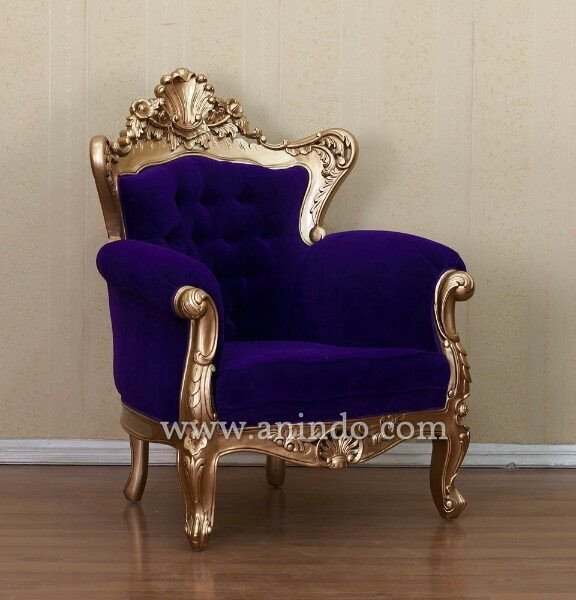 Our bali carved chair is made of solid mahogany wood in gold leaf finish. Upholstered in purple velvet fabric.