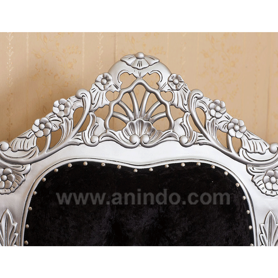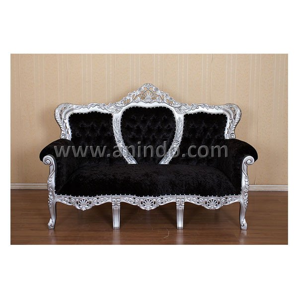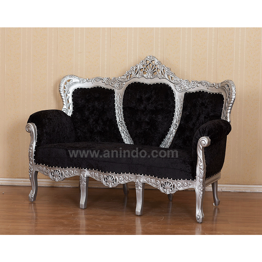 Our?da silva sofa is made of mahogany wood in silver painted finish. Upholstered in black velvet fabric.