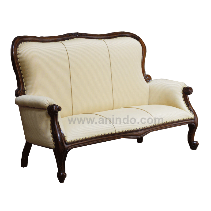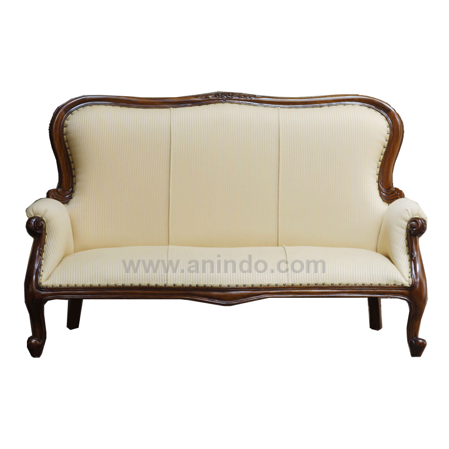 Grandfather 2 seater sofa is made of solid mahogany wood in walnut finish. Upholstered in stripe cream fabric.