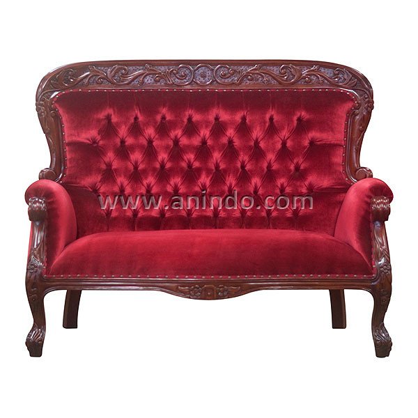 Our grandfather sofa 2 seater is made of mahogany wood in pecan finish. Upholstered in red velvet fabric.