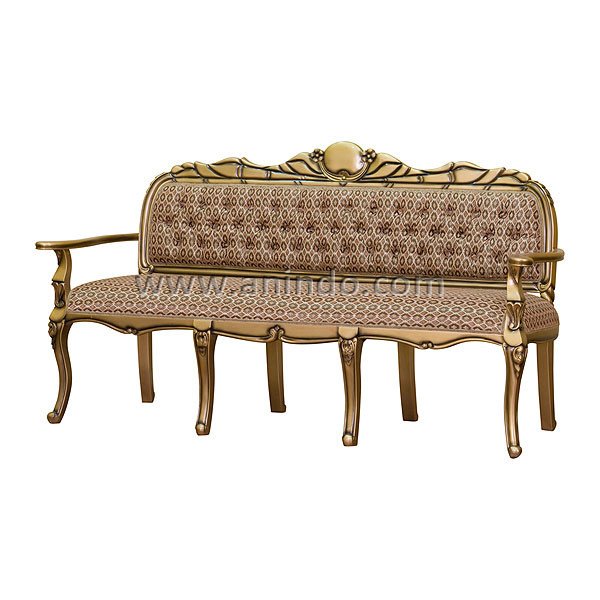 Remo 3 seater sofa is made of mahogany wood in antique gold painted finish. Upholstered in brown motif fabric.