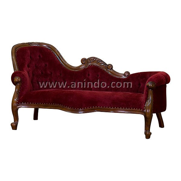 Our?single end sofa is made of mahogany wood in medium mahogany finish. Covered in red velvet fabric.