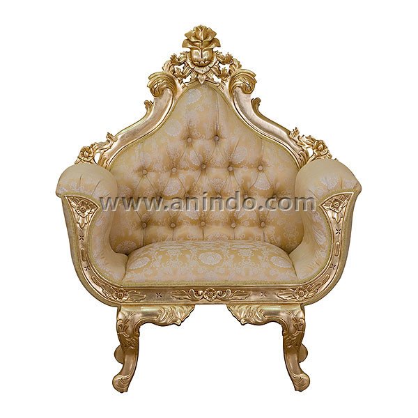 Our wedding sofa 1 seater is made of solid mahogany wood in gold leaf finish. Upholstered in gold floral fabric.