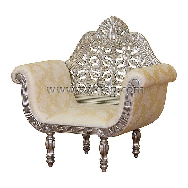 Our wedding sofa carving is made of mahogany wood in silver leaf finish. Upholstered in gold floral fabric.