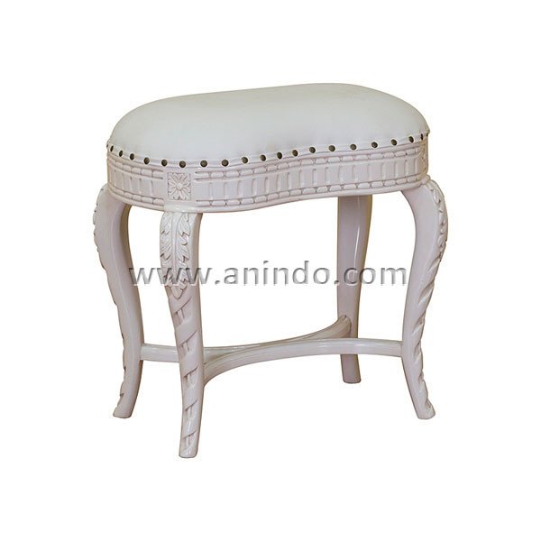 Carved stool is made of solid mahogany wood in white painted finish. Upholstered in white faux leather.