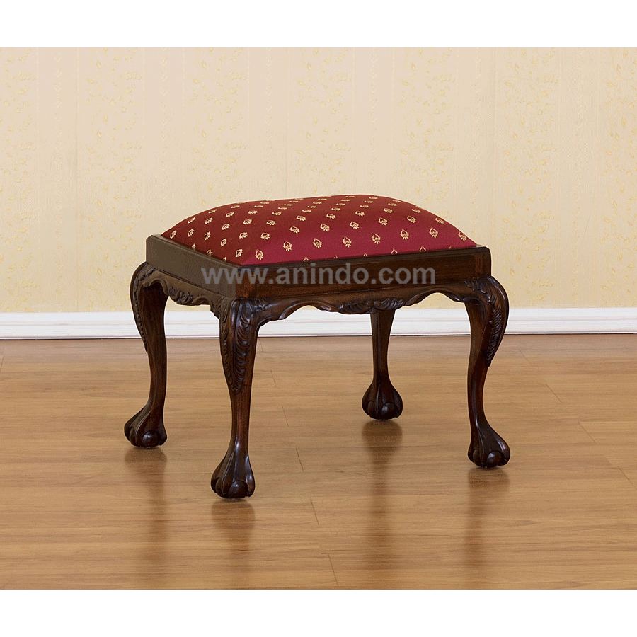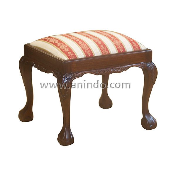 Chippendale leg stool is made of solid mahogany wood in walnut finish. Upholstered in red stripes fabric.