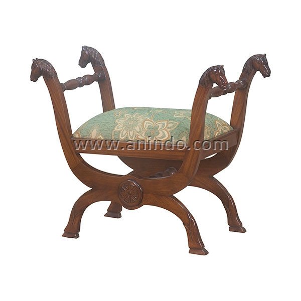 Horse head stool is made of solid mahogany wood in pecan finish. Upholstered in green floral fabric.