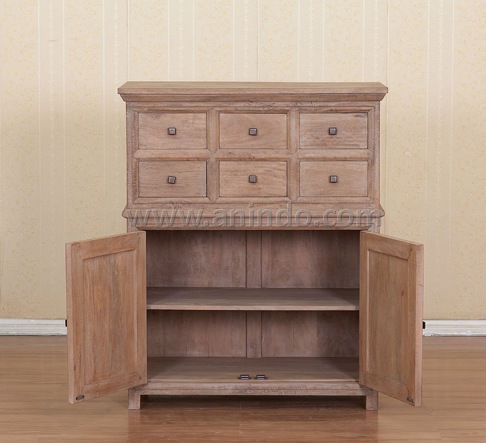 Cabinet 2 doors 6 drawers is made of sustainable solid mango wood in rustic finish. Antique solid brass handles.