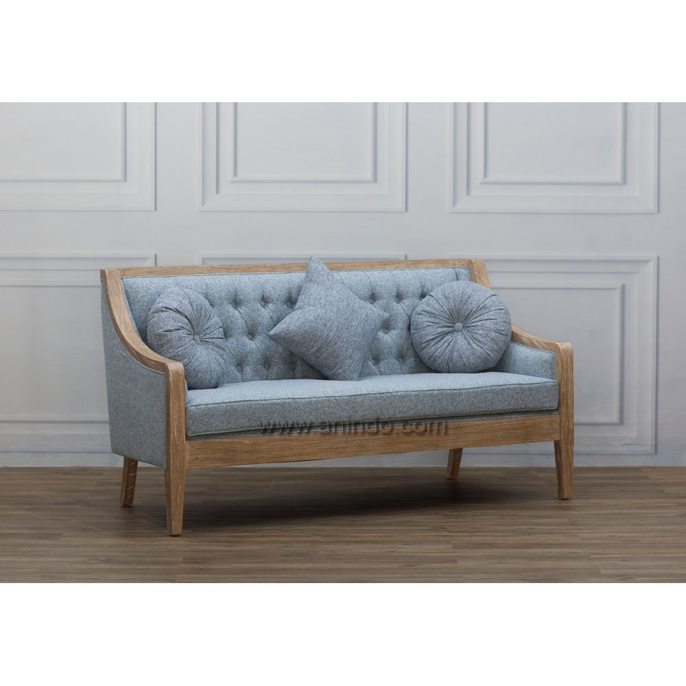 Chandler sofa is made of solid mindi wood. Antique finish. Upholstered in light grey fabric.