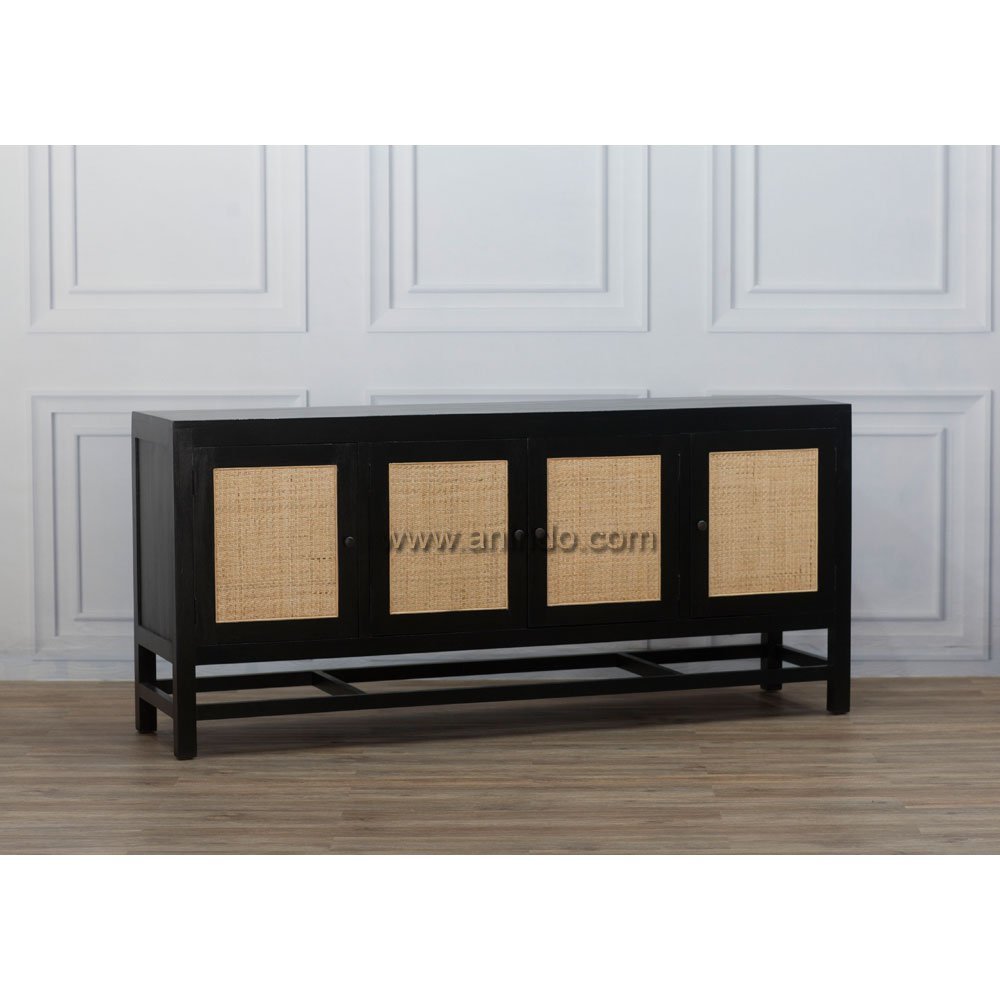 Detroit 4 doors sideboard with natural rattan on doors is made of sustainable solid mango wood. Antique black finish. Antique solid brass handles.